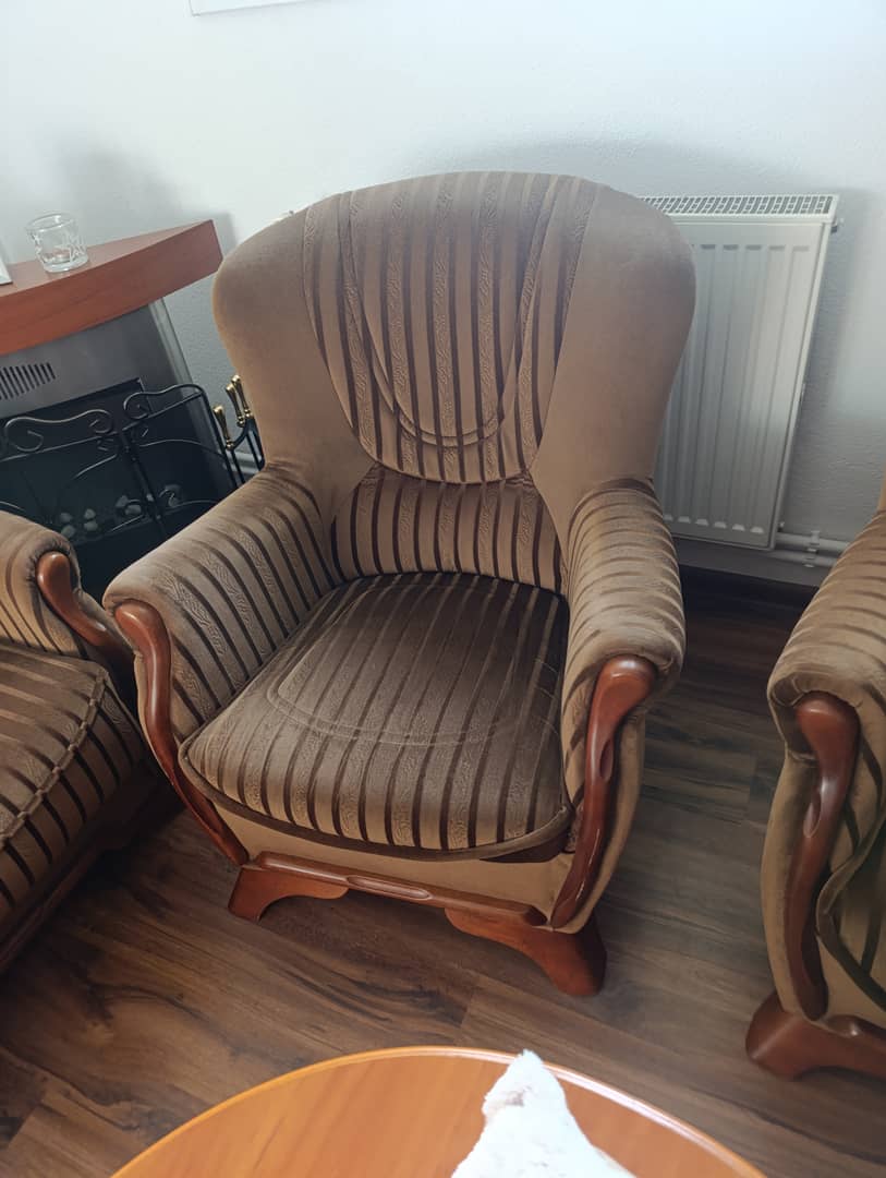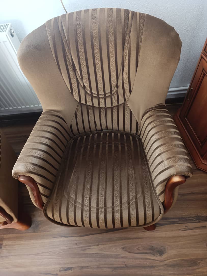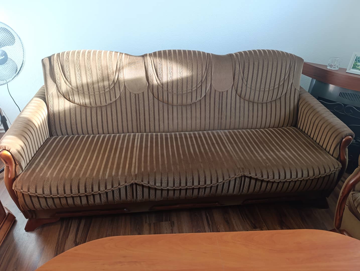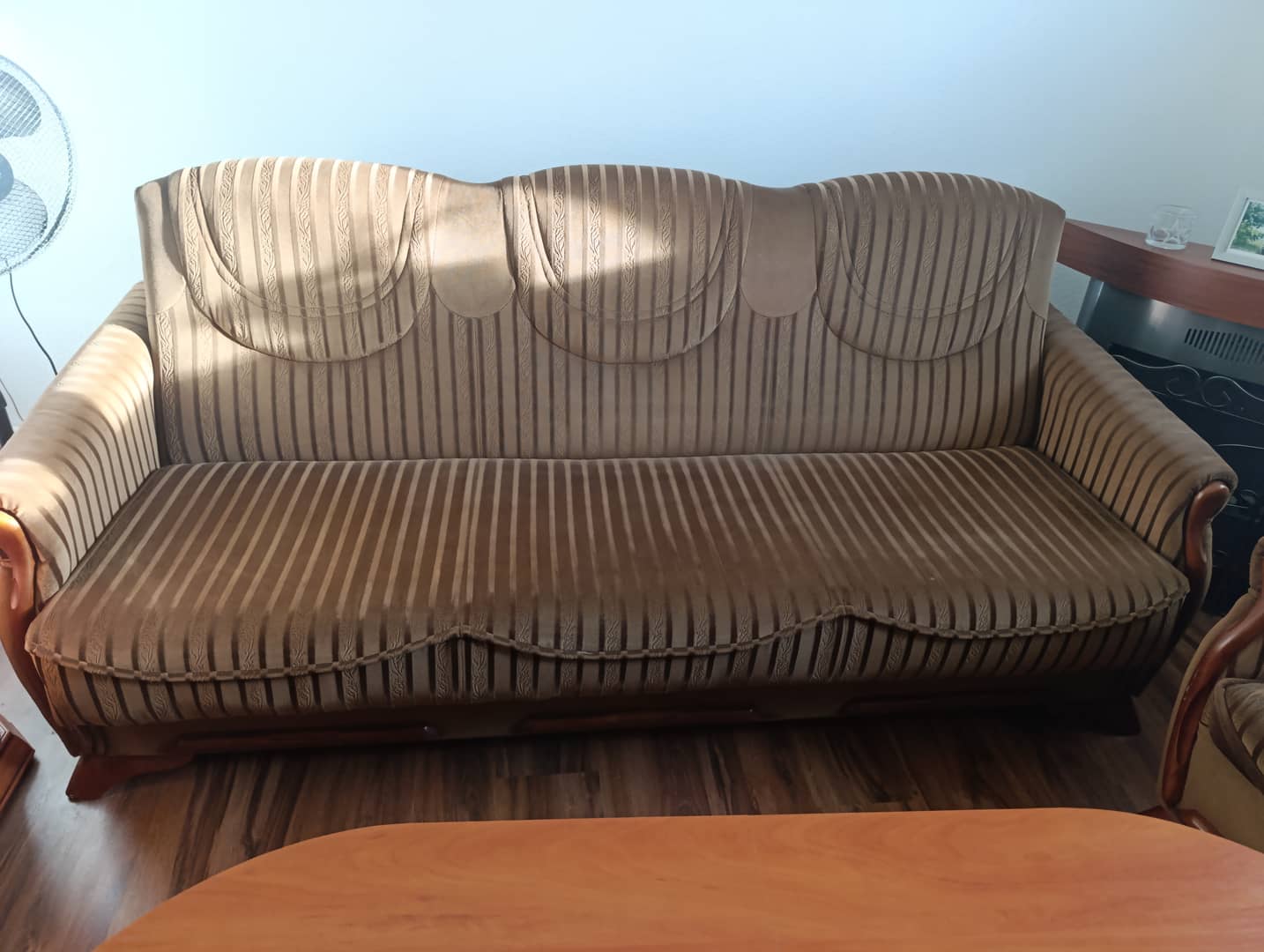Zestaw w stanie bardzo dobrym. Sofa ma długość 210x90cm, a po rozłożeniu 210x120cm. Posiada pojemnik na pościel.