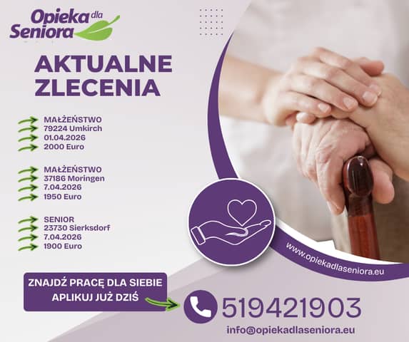 Zlecenie do Seniorki 72668 Schlaitdorf od 7.04.2026 na 4-5 tygodni do 1900 EURO + opłacony przejazd Wymagania: - dobra znajomość języka niemieckiego - prawo jazdy 572366022 Informacje